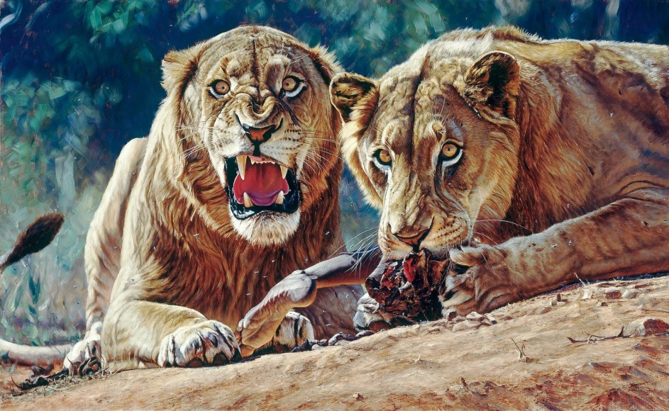 First of all, I didn’t want to be what I guess you would call a starving artist, so I pursued other careers. I tried to escape the art thing many times in my late teens and early 20s by becoming a personal trainer, which was part of an extension of my athletic and bodybuilding career. It was a nice evolution, but I always found myself going back to painting on weekends or when I had extra time. Then I thought, “I always wanted to be a real estate developer. That’s got to be a great idea.” I bought some houses, fixed them up, sold them, made some money, sometimes lost money. Again, always painting on the weekends or painting when I had that free time. And then I realized there was a certain point that I had to really get serious about art if it was going to be something that I was going to pursue. So I entered my works into the Pacific Rim Wildlife Art Show, which was the largest wildlife art show on the West Coast at the time, held in Tacoma, Washington. I entered a small painting; it was 8-by-10 inches, called “In The Heat of the Day,” of two African lions. I purchased a booth and exhibit space, which was in the far right corner of the entire exhibit hall, which is a big, big stadium arena. So, you had to look to find me.