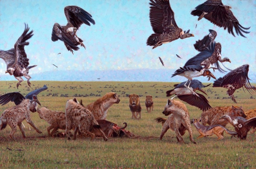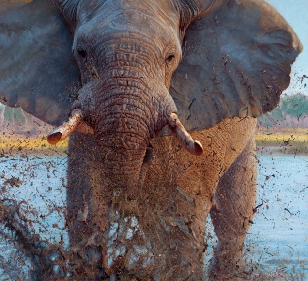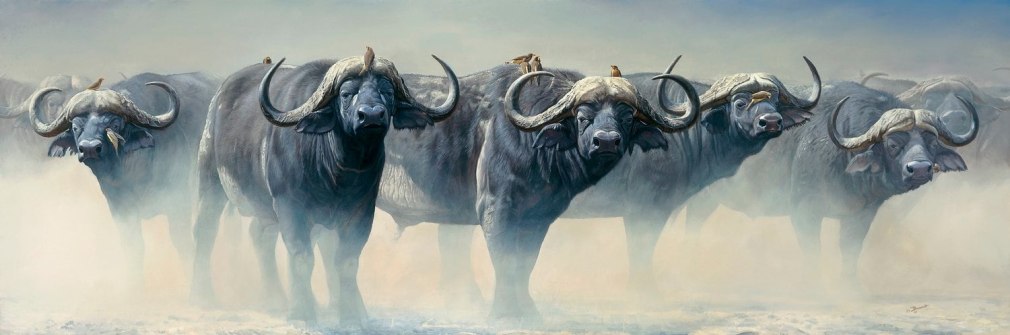 But sometimes I think like a filmmaker, and say, “Okay, I’m looking for a location, I need to find aggressive lines, I need to find Cape buffalo lowering their heads, or lifting their heads up. I want lots of dust.” You can never orchestrate it, because wildlife doesn’t care about your career — they couldn’t care less, in fact. I do have a mission, and I try to find the best scenario to give me the material I need, but you have to be patient. A painting like “The Defensive Line” took 13 trips to Africa to get everything that I needed for the unique faces and shapes: intimate, close-up photographic references. I needed all those details in the eyes because each Cape buffalo in the original is like a foot across, and the whole canvas is 90 inches across. So, fieldwork is important.