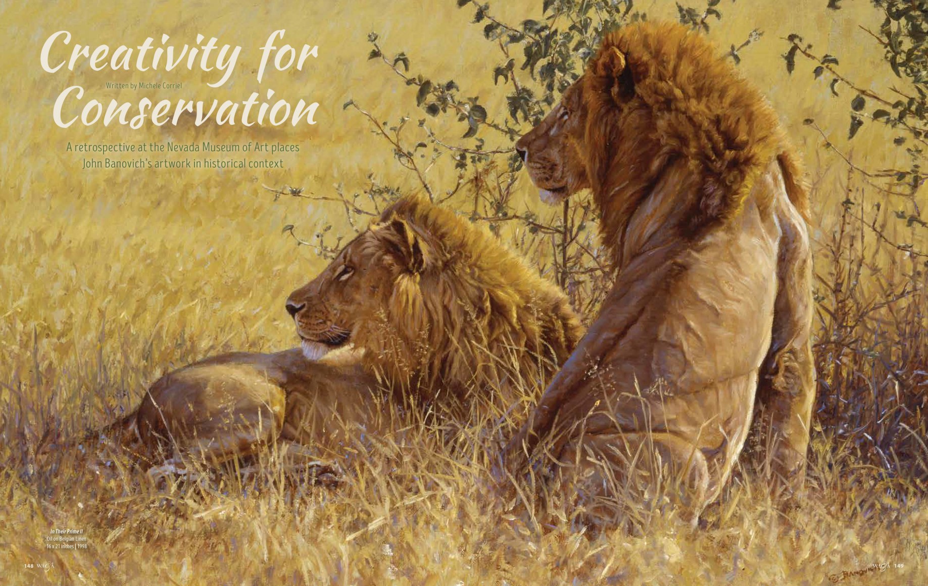 John Banovich’s conservationist ideals, as fierce as the lions he portrays, roar with authenticity. His large paintings express a poignant love for places losing their hold on wilderness, and in turn, they bring to light the delicate balance of the natural world in danger of extinction. Because of this ideology, the Banovich Wildscapes Foundation funds endeavors in Africa to protect endangered areas.