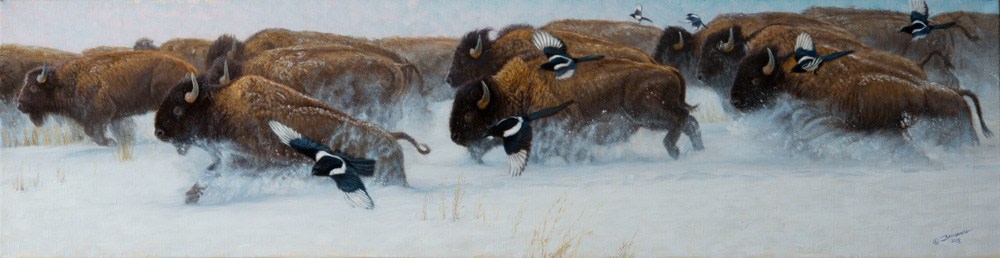 .............Wildlife painter John Banovich takes a more direct approach to animals with his panoramic painting Symbiosis, featuring buffalo running through heavy snow and scattering nearby magpies into the cold winter air. “The black-billed magpie has a long and sordid history with Native Americans and bison. In this symbiotic relationship, the magpies are often found near bison herds feasting on the ticks and ectoparasites found on the shaggy beasts,” he says. “Interesting that the magpie often caches its hoard for consumption at a later date…While the magpie is in the crow family, it is arguably one of North America’s most intelligent birds, and also one of its most beautiful. With a long, iridescent colored tail and wing patches, white chest and wingtips, and coal black face it can be found roaming alongside bison herds across the west. While its diet consists mostly of ground dwelling anthropoids, seed and carrion, it does fancy the blood rich taste of bison and elk’s parasite nemesis…I wanted to portray the movement through the cold air and deep powder of these two symbiotic partners.”